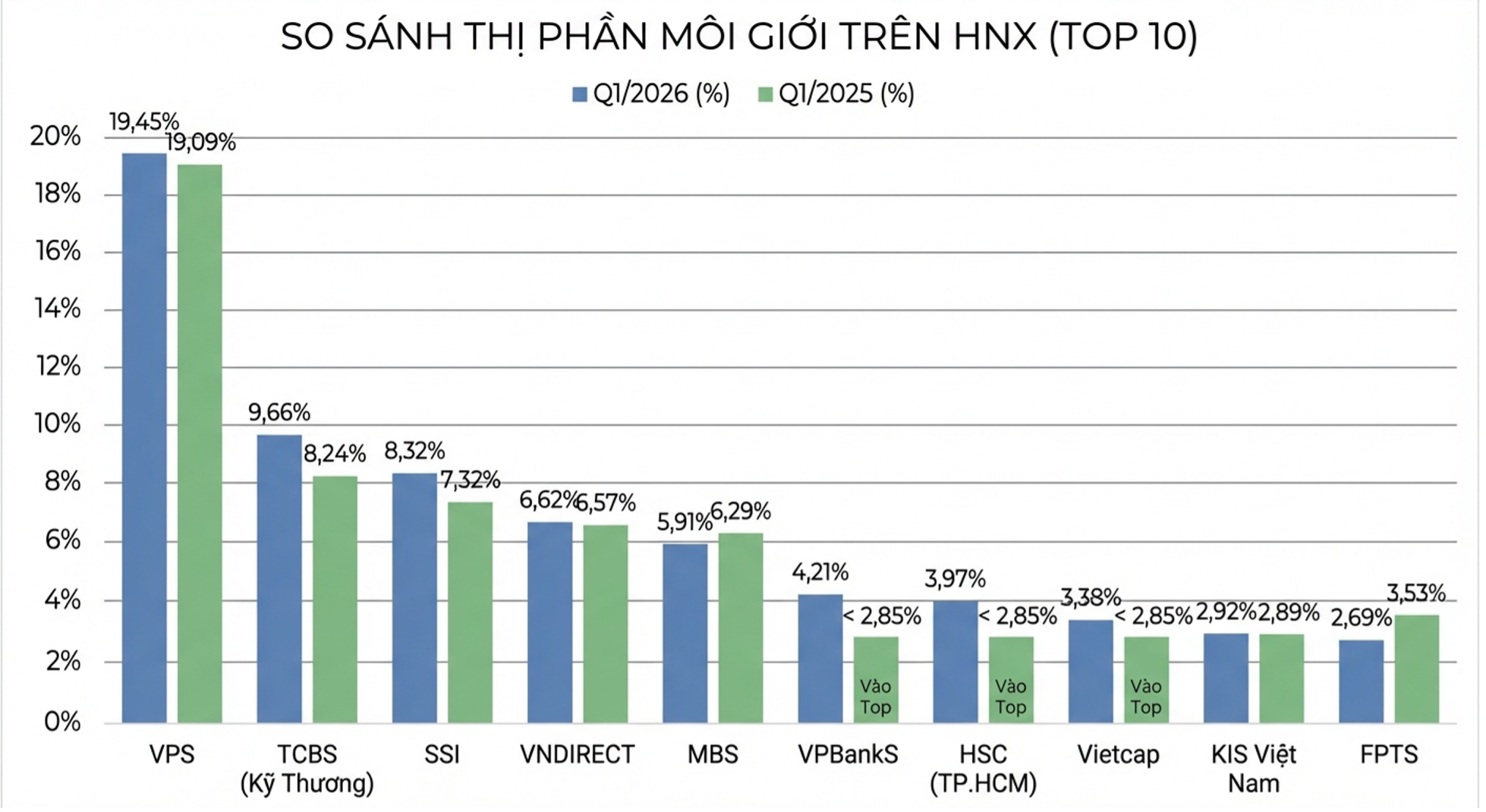 Quý I/2026, thị phần môi giới cổ phiếu trên HNX tiếp tục ghi nhận sự áp đảo của nhóm dẫn đầu. Chứng khoán VPS (HOSE: VCK) duy trì vị trí số 1 với 19,45%, tương đương gần 1/5 toàn thị trường, đồng thời tạo khoảng cách lớn với phần còn lại khi bỏ xa đơn vị đứng thứ hai là Chứng khoán Kỹ Thương (TCBS, HOSE: TCX) tới gấp đôi.