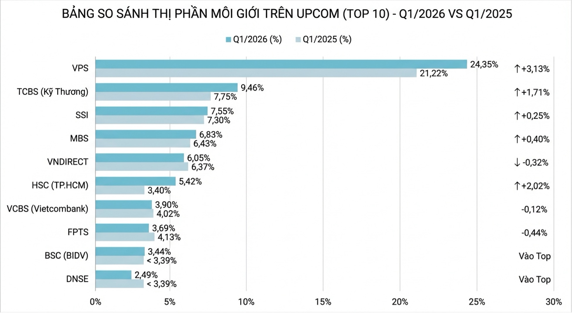 Trên UPCoM, VPS không chỉ giữ vị trí số 1 mà còn gia tăng đáng kể thị phần, từ 21,22% trong quý 1/2025 lên 24,35% trong quý 1/2026. So với mức bình quân cả năm 2025 là 17,76%, mức tăng này cho thấy bước bứt phá rõ rệt.