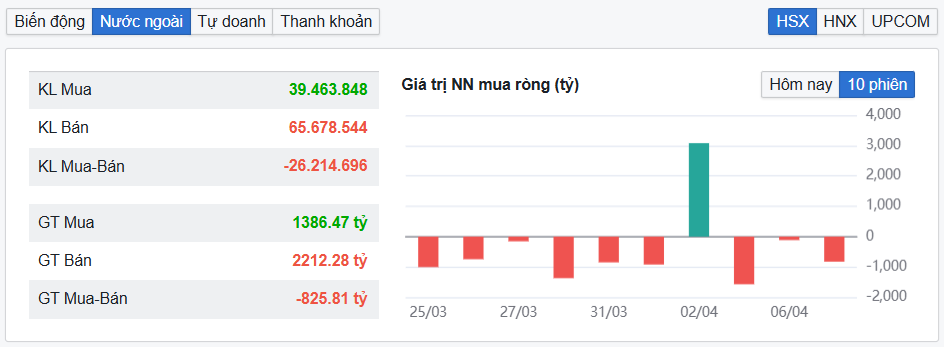Một điểm nhấn khác trong phiên 7/4 là giao dịch của khối ngoại. Khối này vẫn tiếp diễn bán ròng với giá trị gần 826 tỷ đồng. Song, nhìn kỹ vào giao dịch của khối này trong 2 phiên gần đây nhất, trọng tâm của hoạt động bán nằm ở nhóm các cổ phiếu ngân hàng với một số cổ phiếu như TCB, HDB, MBB, ACB, BID; trong khi ở chiều mua là nhóm bất động sản, hóa chất như VIC, NLG, DPM, DCM, PVD, DGC, DIG,…