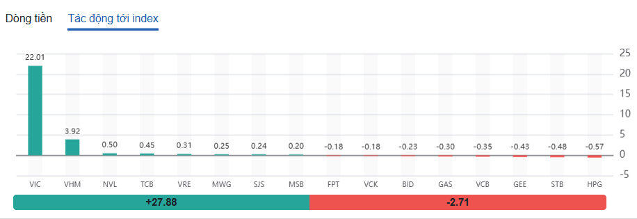 Từ vị thế tác động tiêu cực làm chỉ số suy giảm, VIC đảo chiều đã giúp VN-Index tăng mạnh khi kết phiên. Theo thống kê trên trang fireant, nhóm Vingroup đóng góp vào mức tăng hơn 26,3 điểm. Như vậy, nếu không có nhóm Vingroup, VN-Index sẽ giảm hơn 2,5 điểm trong phiên 22/4.