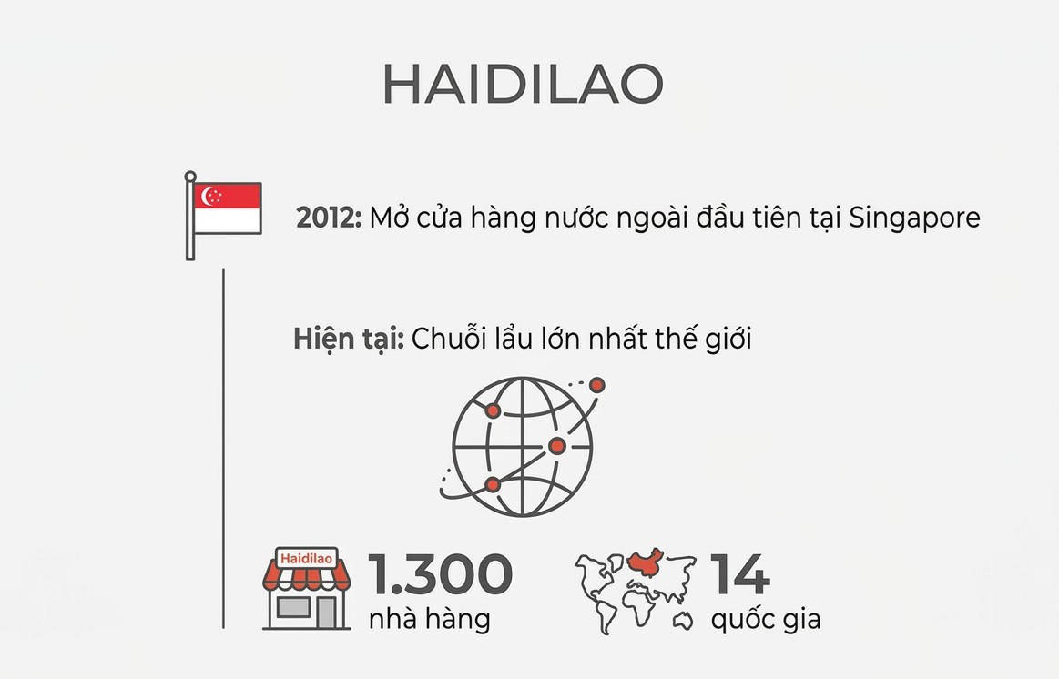 Haidilao đã mở cửa hàng nước ngoài đầu tiên tại Singapore vào năm 2012. Hiện đây là chuỗi lẩu lớn nhất thế giới với 1.300 nhà hàng tại 14 quốc gia.