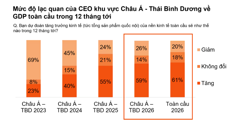 Trong bối cảnh kinh tế toàn cầu nhiều biến động, các doanh nghiệp quốc tế đang điều chỉnh chiến lược đầu tư để thích ứng với những thay đổi về địa chính trị, công nghệ và thương mại. "Khảo sát CEO Toàn cầu lần thứ 29" của PwC cho thấy nhiều lãnh đạo doanh nghiệp tại khu vực Châu Á – Thái Bình Dương vẫn duy trì mức độ lạc quan đáng kể về triển vọng tăng trưởng GDP toàn cầu trong 12 tháng tới.