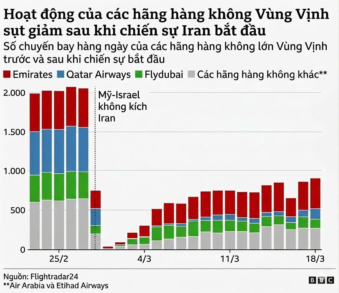 Các hãng hàng không ở Trung Đông đã cắt giảm đáng kể các chuyến bay. Emirates, hãng hàng không lớn nhất khu vực, có kế hoạch thực hiện ít hơn 40% số chuyến bay trong tuần này so với tuần cuối cùng của tháng hai, theo OAG - một công ty tư vấn và dữ liệu hàng không. Các chuyến bay của Qatar Airways giảm 62%, và Etihad giảm hơn 50%.
