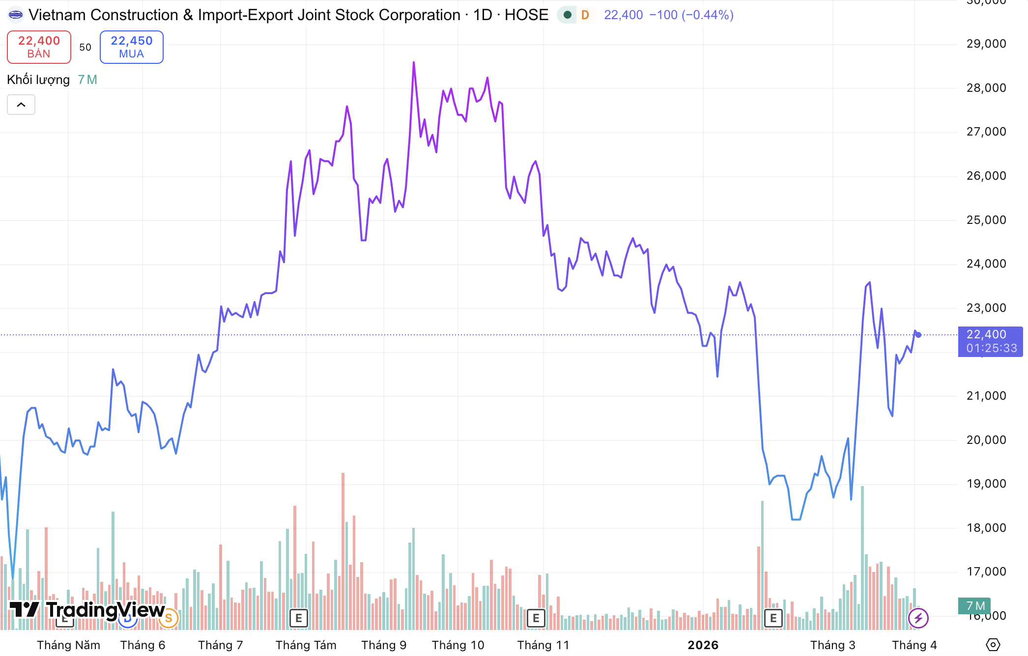 Tuy nhiên, áp lực chốt lời đã khiến thị giá VCG lùi về mức 22.400 đồng/cp trong phiên giao dịch chiều ngày 02/04/2026. Tính chung trong vòng một năm, cổ phiếu VCG vẫn duy trì mức tăng gần 16% với thanh khoản bình quân đạt trên 11 triệu cổ phiếu mỗi phiên.