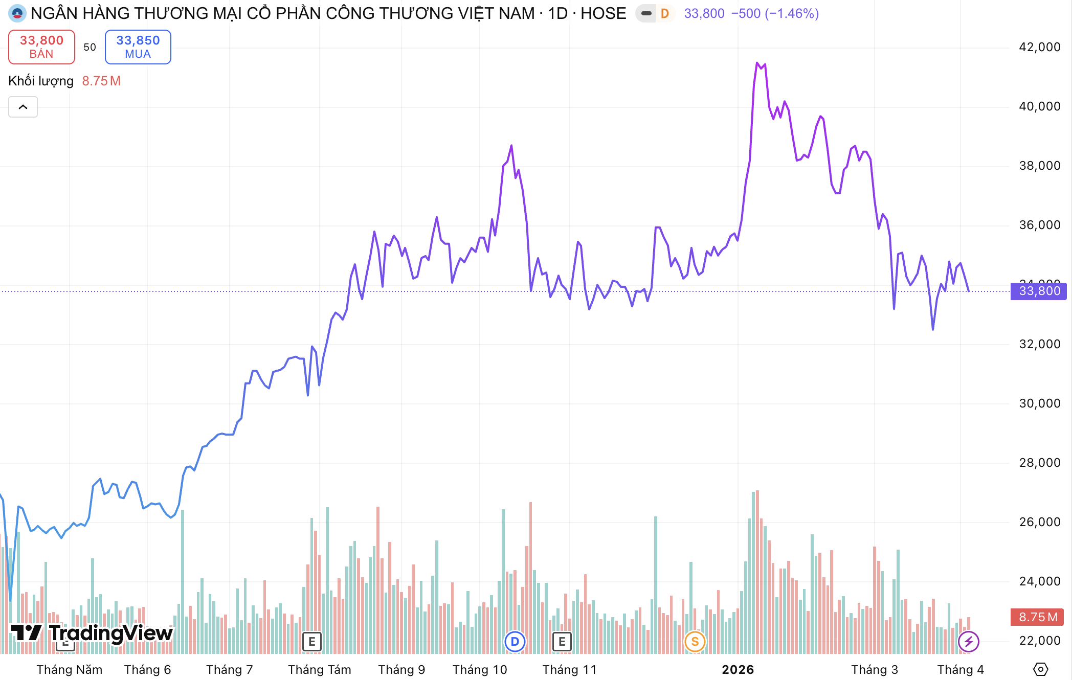 Trên thị trường chứng khoán, cổ phiếu CTG điều chỉnh nhẹ trong tháng gần đây, lùi về mức 33.800 đồng/cp tại ngày 3/4, song vẫn tăng hơn 26% trong vòng một năm, với thanh khoản bình quân hơn 10,8 triệu cổ phiếu mỗi phiên.