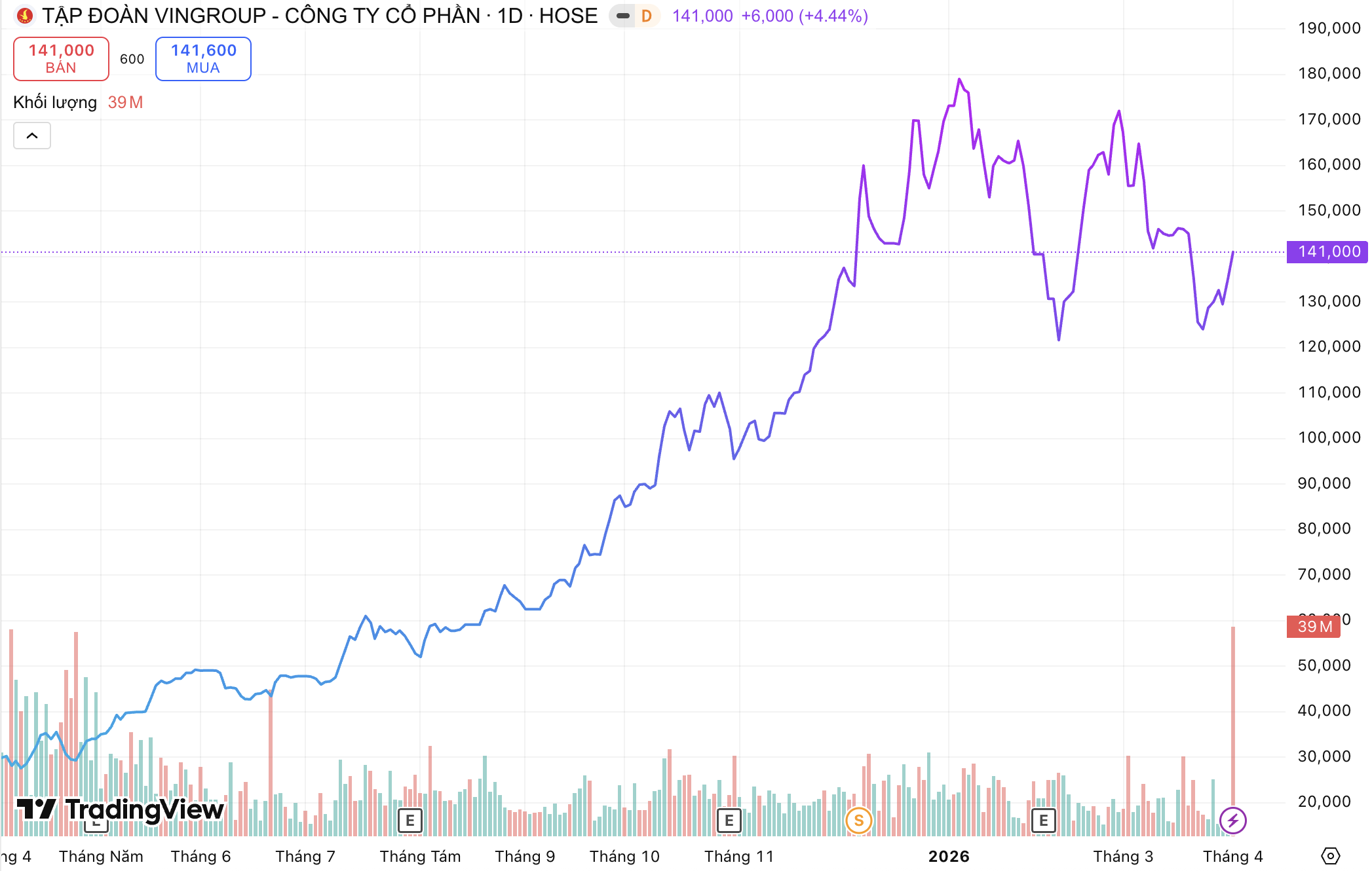 Kết phiên, VIC tăng hơn 4,4% lên 141.000 đồng/cổ phiếu, đưa vốn hóa thị trường trở lại vượt mốc 1 triệu tỷ đồng. Trong vòng một năm, thị giá cổ phiếu này đã tăng gần 367%, với thanh khoản bình quân khoảng 5,2 triệu cổ phiếu mỗi phiên.