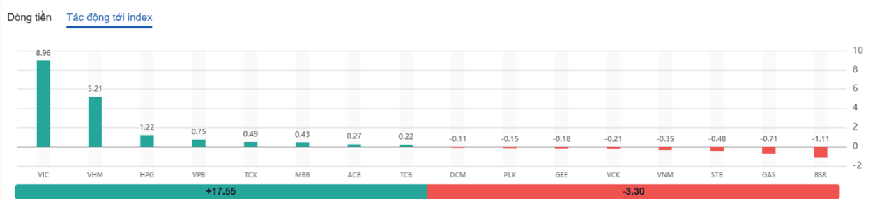 Nhóm cổ phiếu Vingroup vẫn là tâm điểm của đà tăng khi VHM, VIC, VRE đều kết thúc giá xanh, tăng lần lượt 4,88%, 3,44% và 1,27%. Đồng thời, các cổ phiếu ngân hàng như ACB, HDB, MBB, SHB, BID, CTG, TCB, TPB, VPB cũng được quan tâm với khối lượng giao dịch khá lớn. Hay các cổ phiếu nguyên vật liệu như HPG, HSG, NKG, VGS, TLH, BMP, HT1,… đều kết phiên tăng giá, thậm chí kịch trần với dư mua lớn tại mức giá trần.