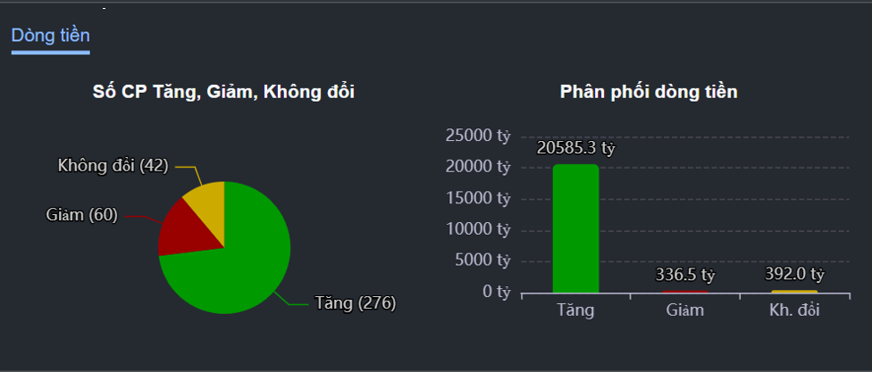 Toàn sàn HOSE có 276 mã tăng điểm với 18 mã tăng trần, áp đảo hoàn toàn so với 60 mã giảm điểm. Về phân phối dòng tiền, gần 20.600 tỷ đồng ở xu hướng tăng và chỉ 336,5 tỷ đồng cho xu hướng giảm.