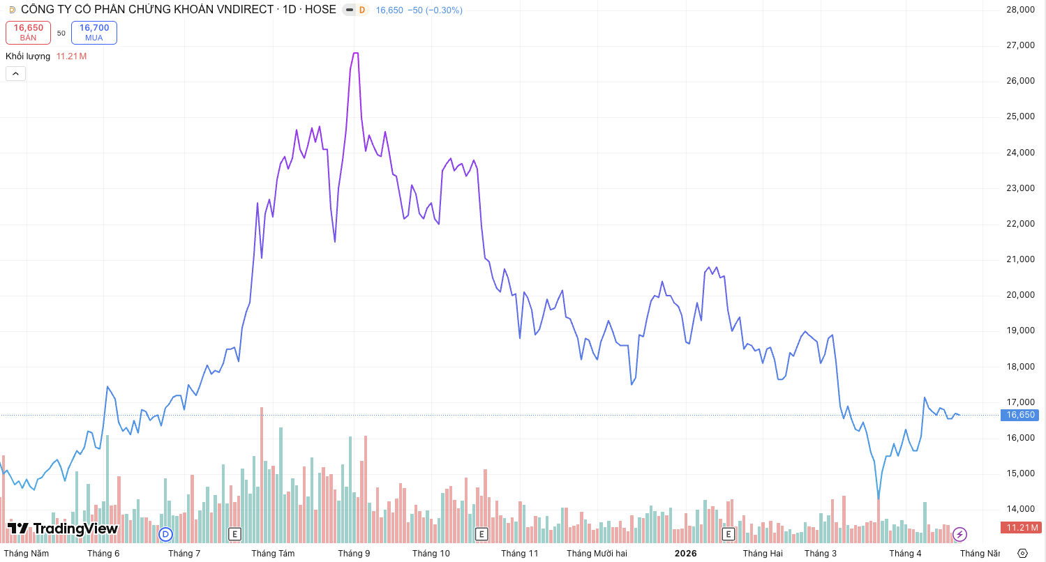 Diễn biến này phần nào đang được phản ánh lên thị giá cổ phiếu VND khi đóng cửa phiên 21/4 ở mức 16.650 đồng/cp, vẫn tăng gần 12% trong vòng một năm qua, thanh khoản duy trì ở mức cao với bình quân hơn 21 triệu cp/ngày. Tuy nhiên, việc doanh nghiệp chưa công bố kế hoạch kinh doanh 2026 trước thềm ĐHĐCĐ thường niên dự kiến tổ chức ngày 18/5 tại Hà Nội, khiến dư địa đánh giá mức độ hoàn thành và áp lực tăng trưởng trong các quý tới vẫn còn bỏ ngỏ.
