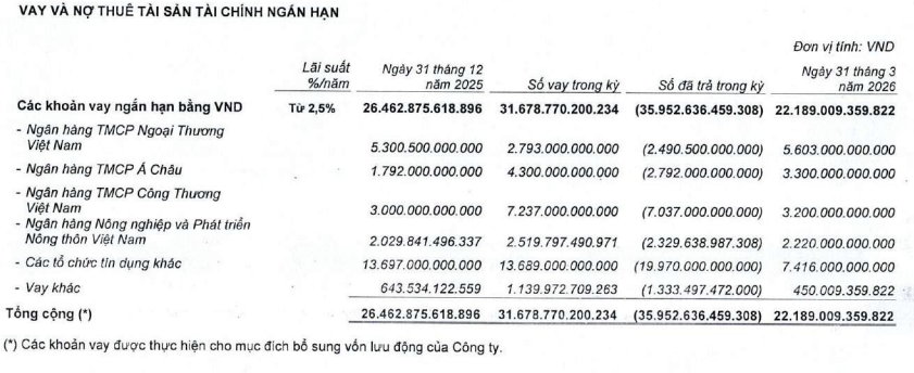 Ở chiều ngược lại, nợ phải trả giảm mạnh hơn, xuống còn hơn 26.500 tỷ đồng, giảm hơn 4.200 tỷ đồng, trong đó vay ngắn hạn chiếm gần 22.200 tỷ đồng. Các khoản vay chủ yếu đến từ các ngân hàng như Vietcombank, ACB, VietinBank và Agribank.