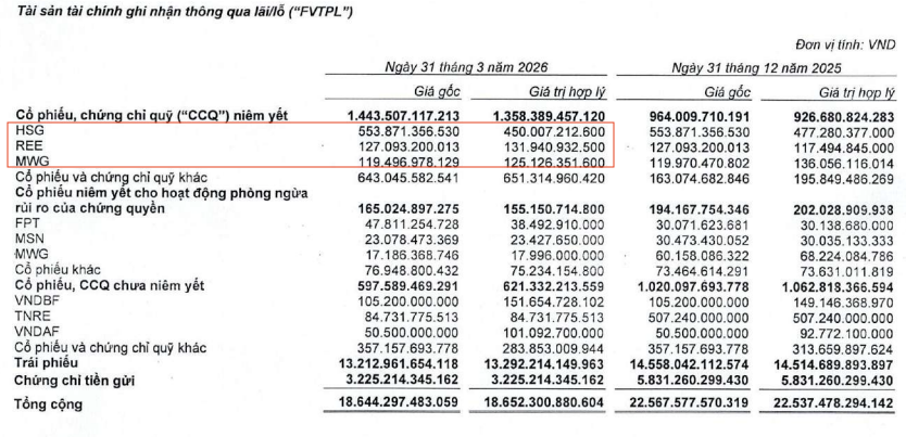 Tuy nhiên, biến động danh mục cho thấy chiến lược đang thay đổi rõ rệt. Tại thời điểm cuối quý I/2026, giá gốc danh mục FVTPL của VNDIRECT giảm hơn 3.900 tỷ đồng so với đầu năm, xuống còn hơn 18.600 tỷ đồng. Trong đó, khoản mục cổ phiếu và chứng chỉ quỹ chưa niêm yết giảm mạnh hơn 41%, chỉ còn 597,5 tỷ đồng, trong khi danh mục trái phiếu dù giảm nhẹ nhưng vẫn chiếm tỷ trọng áp đảo với hơn 13.200 tỷ đồng, tương đương gần 71%.