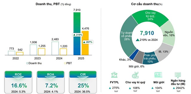 Nhận định về kết quả năm 2025, Tổng Giám đốc VPBankS nhấn mạnh cùng với tăng trưởng quy mô, công ty cũng ghi nhận doanh thu và lợi nhuận ấn tượng, lần lượt đạt 7,910 tỷ đồng và 4,476 tỷ đồng, gấp hơn 3 lần cùng kỳ, đạt kế hoạch mục tiêu đã điều chỉnh. Đồng thời, ROE (tỷ lệ lợi nhuận trên vốn chủ sở hữu) cũng đạt 16.6%, trong nhóm dẫn đầu và CIR (tỷ lệ chi phí trên thu nhập hoạt động) giảm từ 36.5% vào năm 2024 xuống 25%.