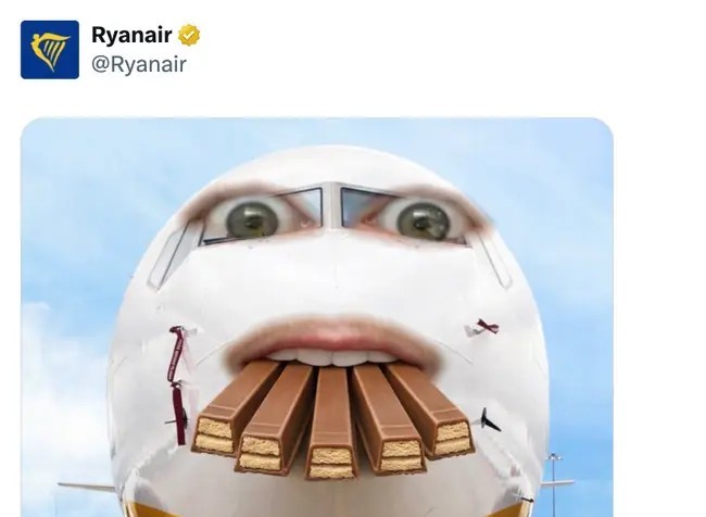 Trong khi đó, hãng hàng không giá rẻ Ryanair chỉ đơn giản đăng bức ảnh hoạt hình một chiếc máy bay của hãng với khuôn mặt. Trong miệng của chiếc máy bay là 5 thanh KitKat bị cắn dở.