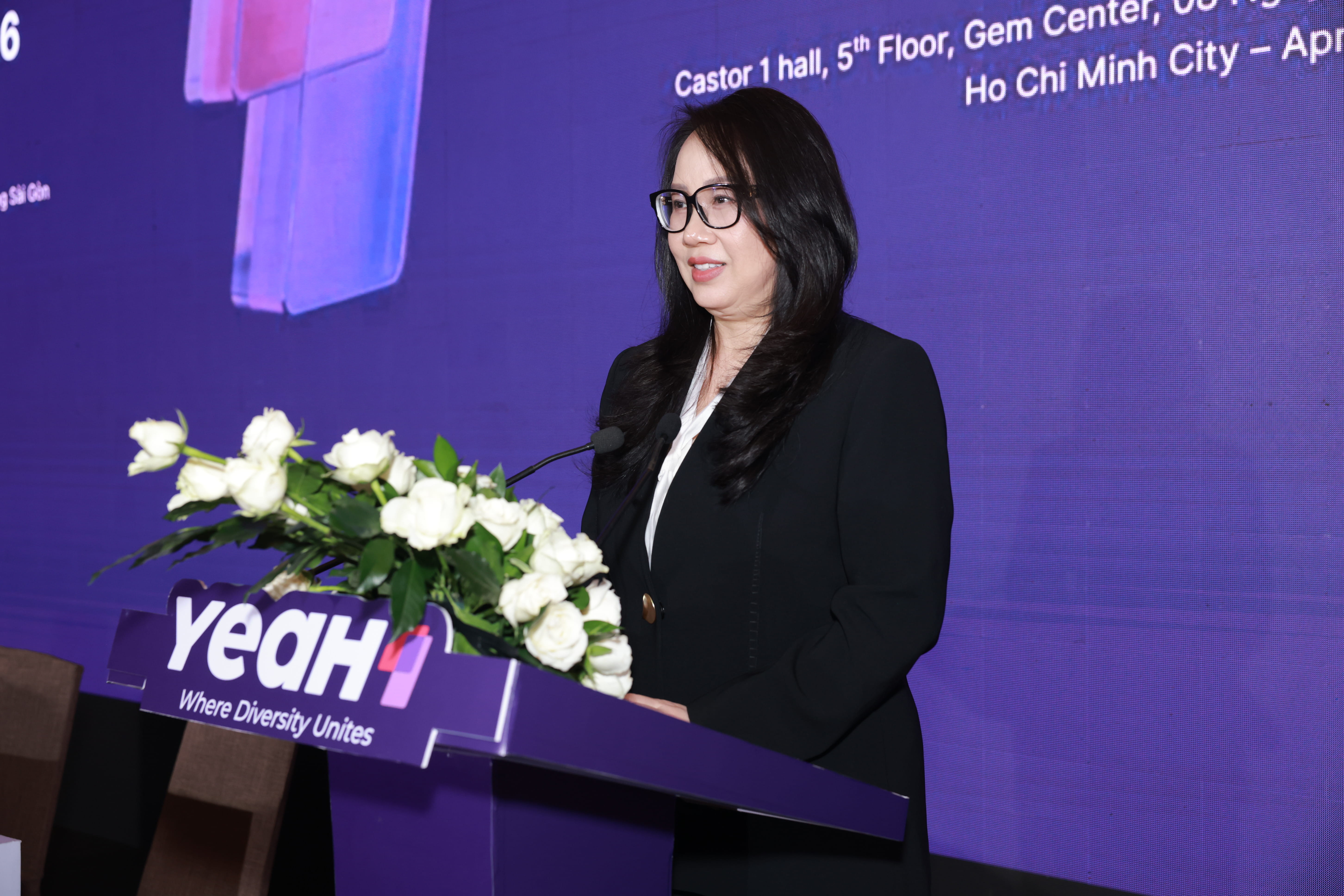Bà Ngô Thị Vân Hạnh, Tổng Giám đốc chia sẻ định hướng của YeaH1 tại đại hội. Ảnh: TL